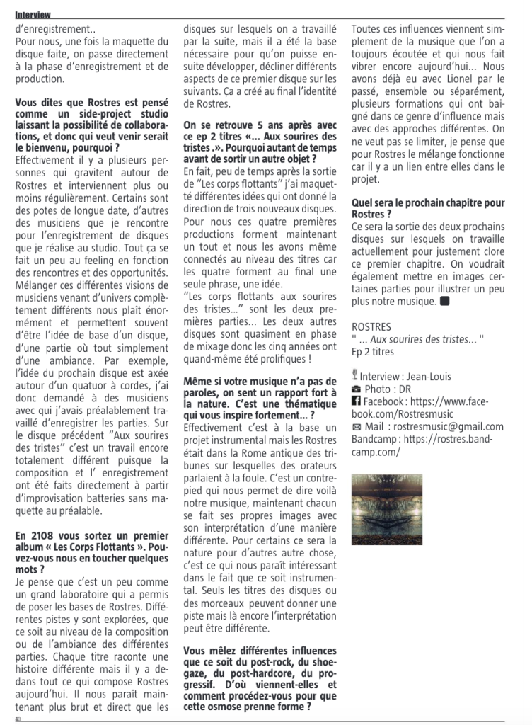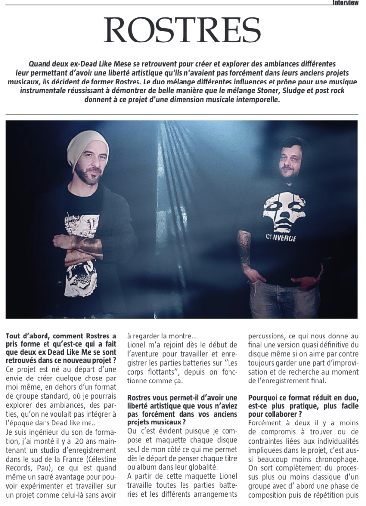 当两位 Dead Like Me 前成员再次相聚,想要创作并探索不同氛围、拥有他们在旧乐队中未必能拥有的艺术自由时,他们决定成立 Rostres。这个双人组合融合了多种影响,追求一种纯器乐的表达方式;他们很好地展示了 Stoner、Sludge 与 Post-rock 的融合,使这个项目拥有一种超越时间感的音乐维度。